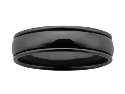 Black Zircon wedding ring WD10BGGZ6. This design has a jet black band with a polished finish and it is available at 6mm and 8mm wide. Zirconium is from s-type giant stars and is very hard with a jet black finish. These rings are very stylish and specially made to your finger size.
