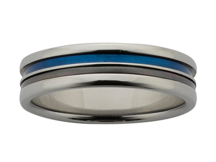 Black Zircon wedding ring WD559Z6. This band is 6mm wide Titanium with a blue groove, and Black Zirconium inlay with polished finish. Zirconium is from s-type giant stars and is very hard with a jet black finish. These rings are very stylish and specially made to your finger size.